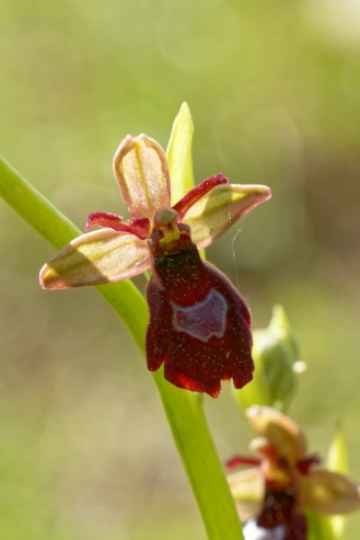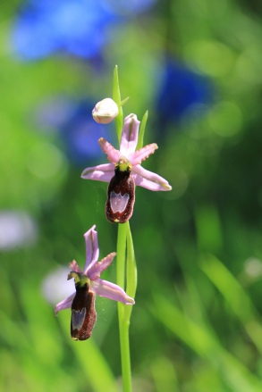 L’ophrys drumana est une très belle orchidée. Endémique du Sud-Est de la France, on la retrouve particulièrement dans le département de la Drôme. La plante est assez haute (10 à 25 cm) avec de nombreuses et petites fleurs à périanthe rose. Le labelle est de couleur très sombre avec une macule généralement bleuâtre virant à jaune.