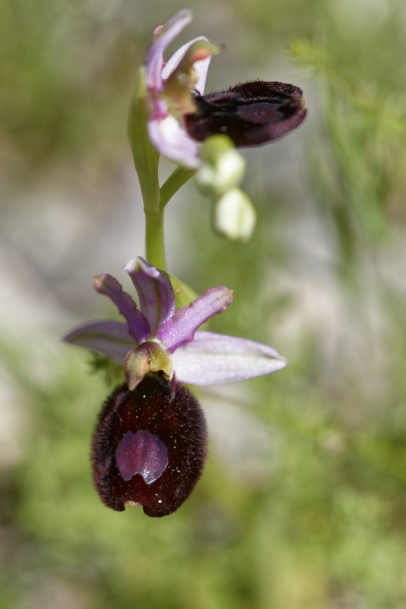 L’ophrys bertolonii est une très belle orchidée avec de grandes fleurs au nombre de 3 à 6, un périanthe rose et un labelle couvert d’une pilosité dense de couleur brun-noirâtre et orné d’une macule bleuâtre à rougeâtre. Les sépales roses ont une nervure médiane de couleur verte. On retrouve cet ophrys principalement en bordure de méditerranée.