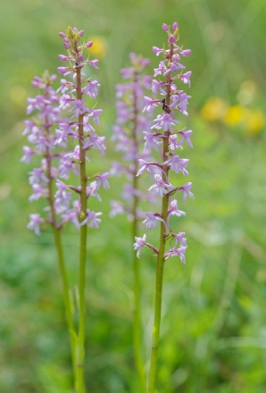 L’orchis moucheron est une orchidée courante en Rhône-Alpes et dans des lieux très variés. La plante est élancée, jusqu’à 90 cm et porte de nombreuses et jolies fleurs roses en un épi étroit et cylindrique. Le labelle a trois lobes à peu près égaux. De pleine lumière à ombre légère, jusqu’à 2800 m.
