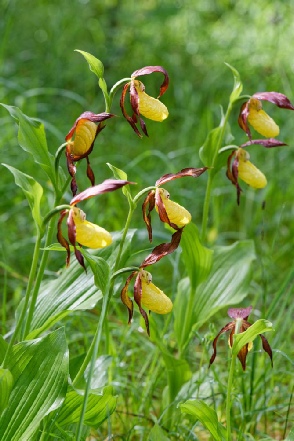 Le Cypripedium calceolus est une plante mythique pour les orchidophiles. C’est un joyau de nos montagnes. C’est une grande orchidée, à feuilles larges tout le long de la tige, avec un labelle jaune vif en forme de sabot. Les pétales et sépales sont de couleur brun foncé. On peut la trouver à mi-ombre, sur sol calcaire de 500 à 2000 m, optimum à 1200 m. On ne peut la confondre avec aucune autre orchidée. On lui donne plusieurs noms : sabot de vénus, soulier de la vierge ou encore pantoufle de notre dame !