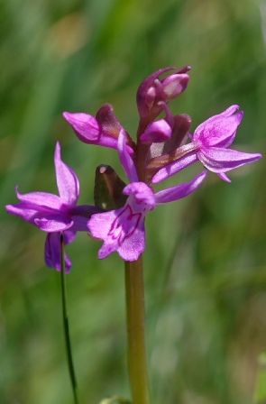 Dactylorhiza traunsteineri est une plante grêle, haute de 20 à 45 cm, à tige violacée près de l’épi floral, faiblement compressée. Les feuilles sont généralement maculées. Elle a entre 8 et 20 fleurs de couleur pourpre violacée foncé. Le labelle est trilobé et orné de lignes et tirets. On la trouve sur substrats humides, de 500 à 2500 m. Espèce rare.